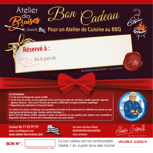 Vous cherchez une idée de cadeau originale ? Offrez un bon cadeau pour un cours de barbecue ! Une expérience gourmande et conviviale pour les amateurs de grillades, parfaite pour célébrer un anniversaire, Noël ou tout autre événement spécial. Apprenez l'art du barbecue avec des chefs experts et maîtrisez les techniques de cuisson au feu, des marinades savoureuses aux meilleures astuces pour réussir chaque grillade. Faites plaisir à vos proches avec un cadeau mémorable et plein de saveurs !
